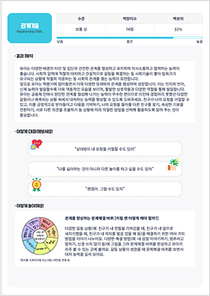 5가지 핵심역량의 결과에 해석이 제공되어, 현재의 발달 상황에 대한 이해를 도울 수 있습니다.