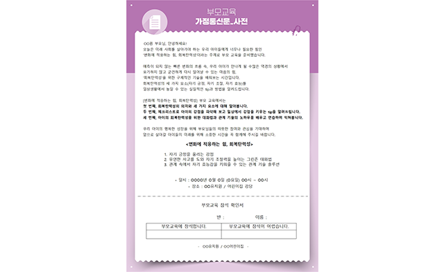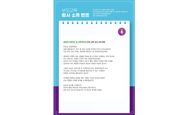“급변하는 시기에 진정으로 가르쳐야 할 부분이 회복탄력성이라는 것을 다시 한 번 확인할 수 있는 기회였습니다. 자녀 뿐만 아니라 부부가 함께 서로의 회복탄력성을 위해 노력해가면서 우리 아이의 역량을 더 바르고 올바르게 키워 나갈 수 있도록 함께 해야겠습니다.”
