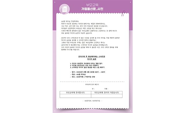 OOO엄마“저희 부부는 나름대로 아이에게 미디어 사용 방법과 규칙을 잘 지키고 제시하고 있다고 생각해왔어요. 그런데 오늘 교육을 받고 나니 제가 미처 생각하지 못했던 부분이 아이에게 안 좋은 영향을 주고 있었다는 사실을 알게 됐어요. 미디어 과의존 부작용을 겪지 않도록 오늘 배운 방법을 하나씩 실천할게요!”