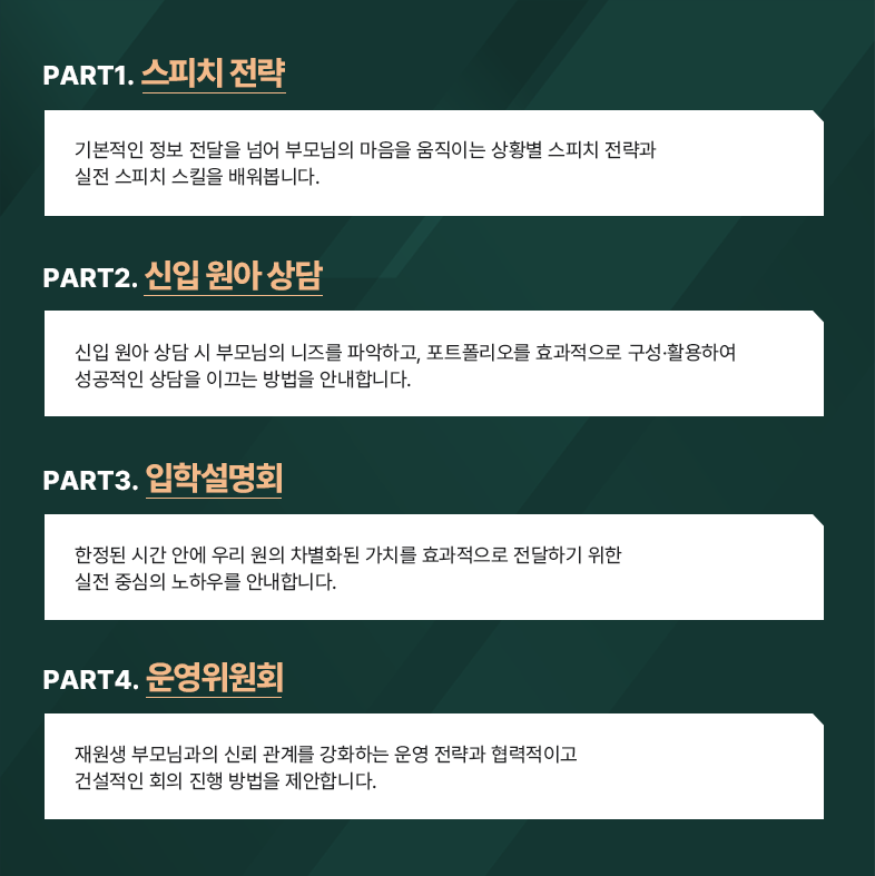 - - 구성: [원장님의 스피치], [상담 스킬과 상담 언어], [중간관리자 워크숍], [AI 브랜딩 365], [오리엔테이션 전략 가이드]