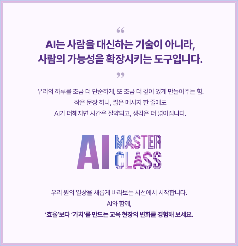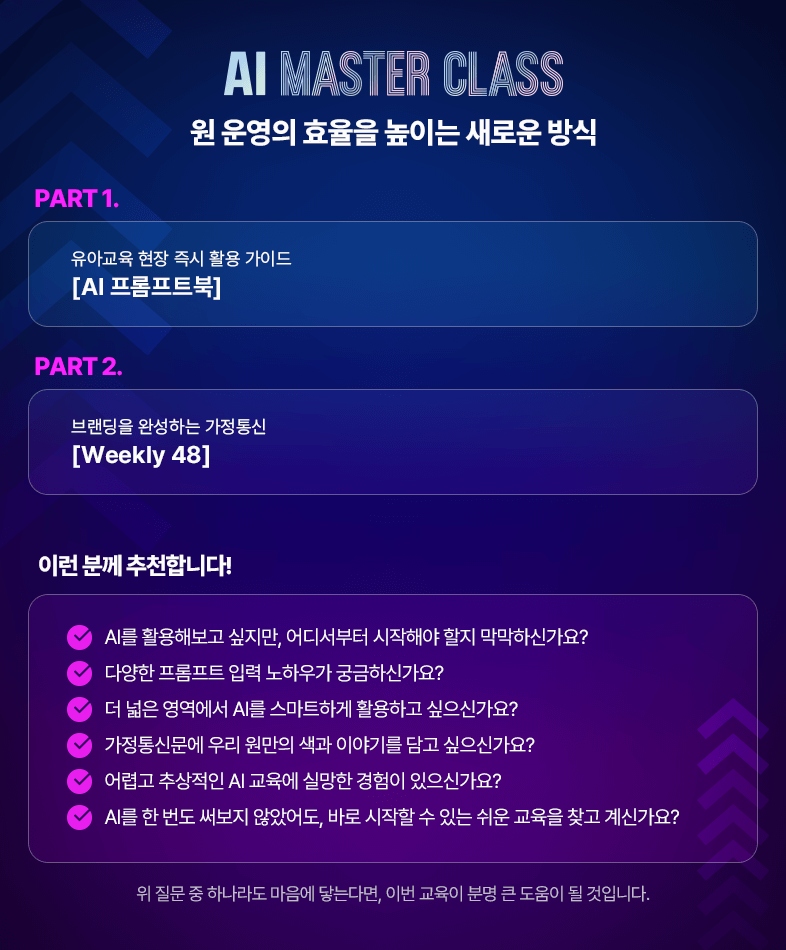 AI는 우리의 일상을 더 효율적이고 창의적으로 변화시키는 도구입니다. 하지만 어떻게 활용하느냐에 따라 결과는 전혀 달라집니다. 이번 교육에서는 우리 원의 가정통신문을 한층 더 완성도 높게 다듬는 방법부터,내부 문서와 업무, 교사 관리, 부모 소통에 이르기까지 어디에서도 들을 수 없는 차별화된 현장형 AI 활용법을 전합니다. AI를 부담 없이, 그러나 전략적으로 사용하는 가장 실질적인 방법을 만나보세요.
