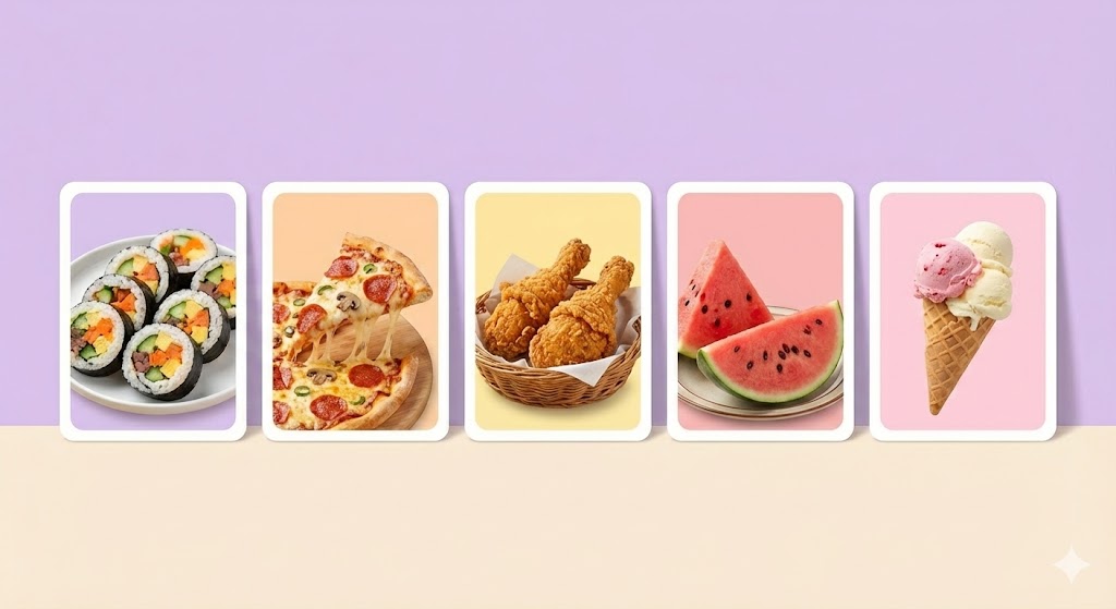 각 카드에는 음식 이름과 특징, 그리고 아이와 나눌 수 있는 대화 팁이 담겨 있어요.