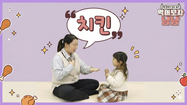 놀이 대화 팁: "치킨 먹을 때 어떤 소리가 날까? 귀를 기울여보자. 바사삭! 정말 맛있는 소리네!"