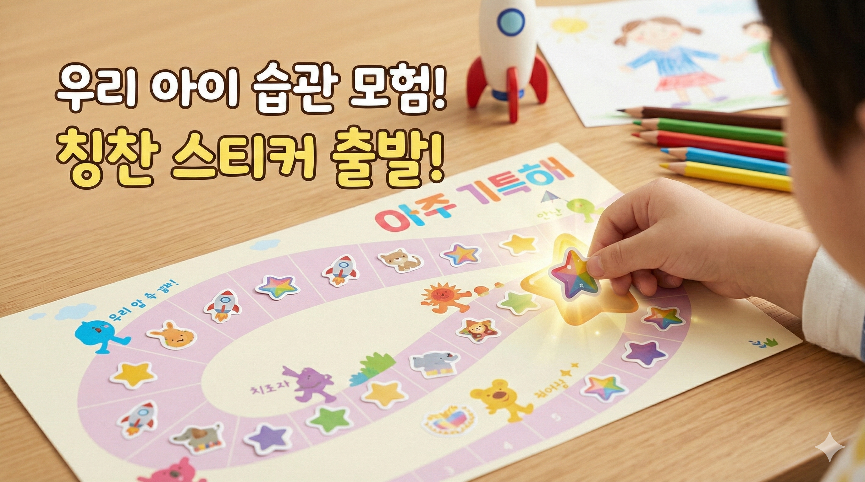 3.완성 축하: 스티커판을 다 채우면 함께 기뻐하고, 약속한 작은 보상(함께 공원 가기 등)을 선물합니다.