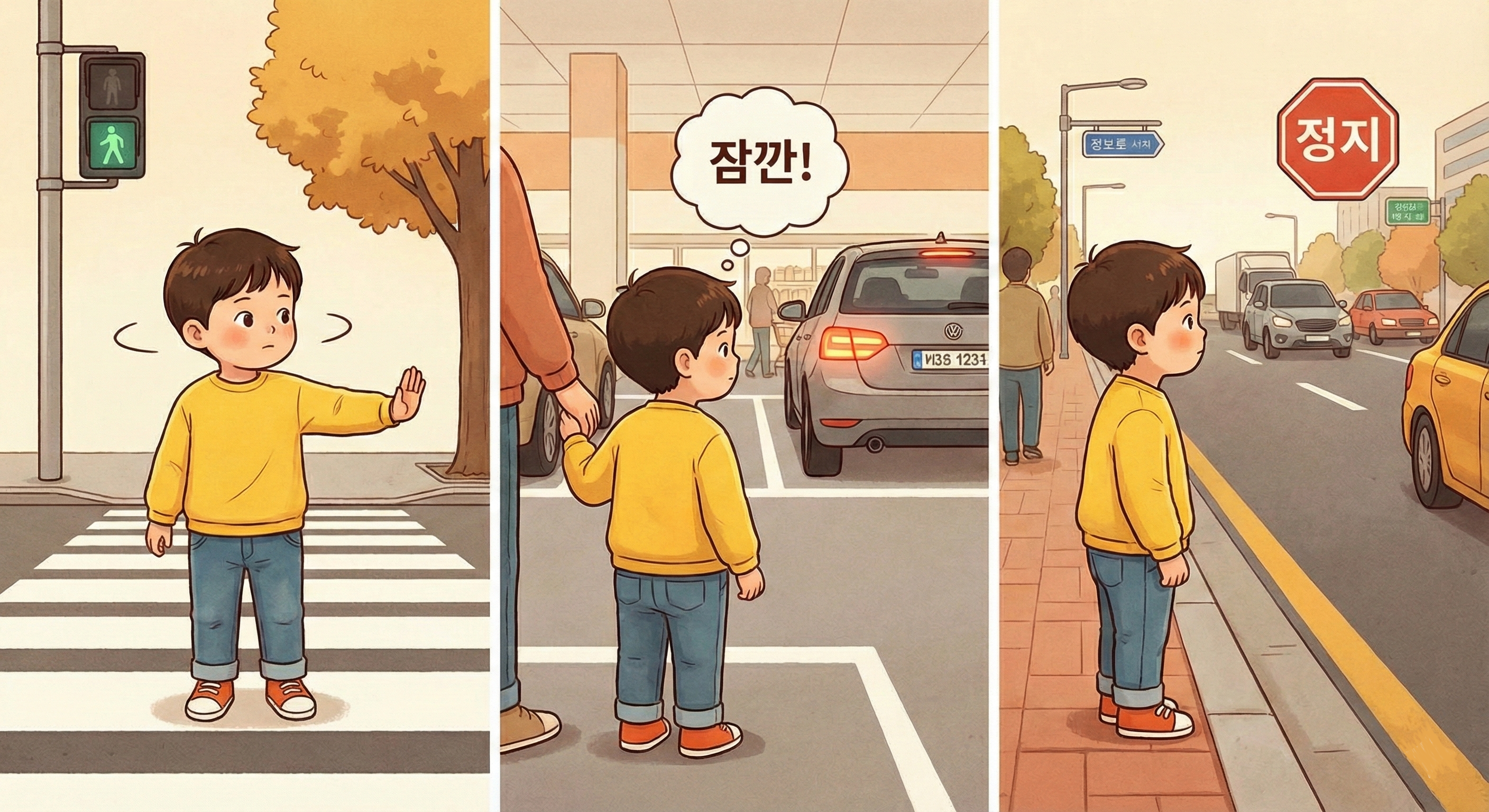 횡단보도: 초록불이 켜져도 바로 뛰어나가지 않고 '잠깐' 멈춰서 살펴요.