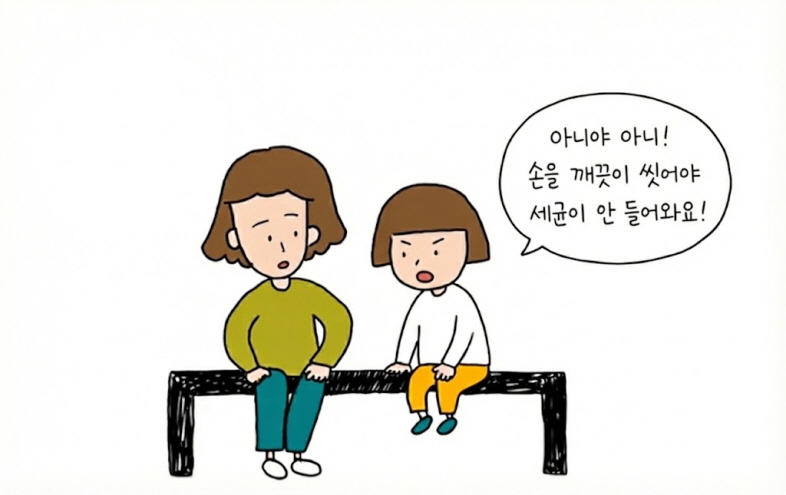 아이: "아니야 아니! 손을 깨끗이 씻어야 세균이 안 들어와요!"