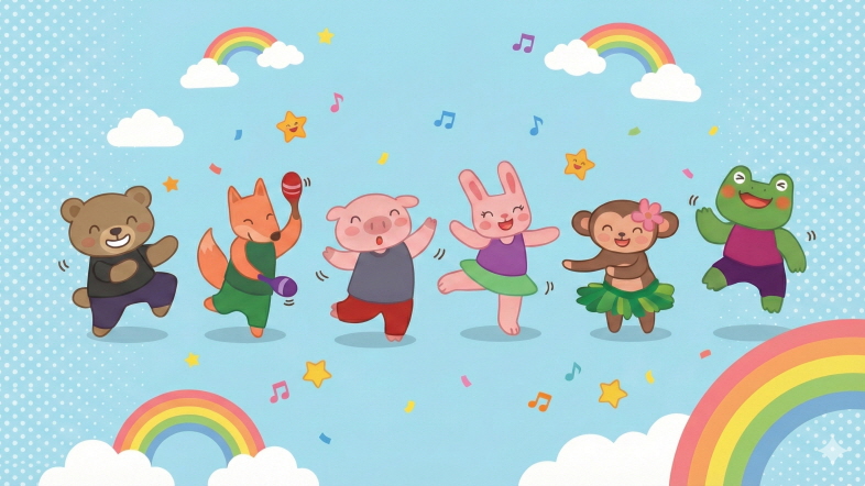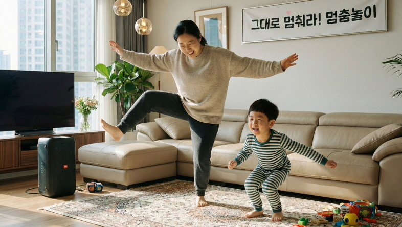 아이들은 신나게 움직이다가 순간적으로 동작을 멈추는 과정을 통해 자기 조절 능력(Self-regulation)과 집중력을 기를 수 있으며, 거창한 준비물 없이 오직 '동요' 하나만으로 아이와 깔깔 웃으며 즐길 수 있어요.