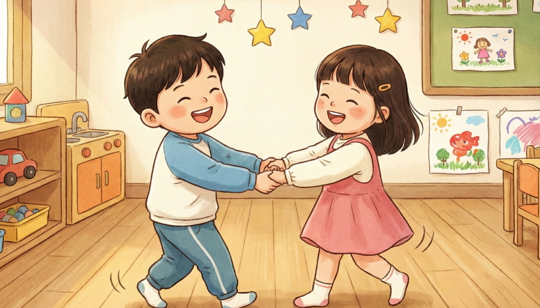 "둘이 살짝 손잡고 오른쪽/왼쪽으로 돌아요": 아이의 손을 부드럽게 잡고 해당 방향으로 한 바퀴 천천히 돕니다.