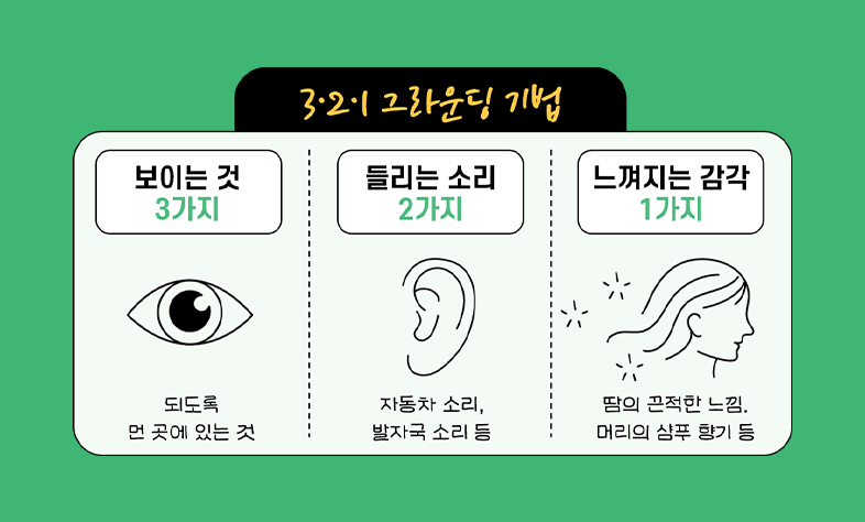 ✔ 3·2·1 그라운딩 놀이 : 시각, 청각, 촉각에 집중하여 흥분한 감정을 가라앉히는 오감 놀이 기술